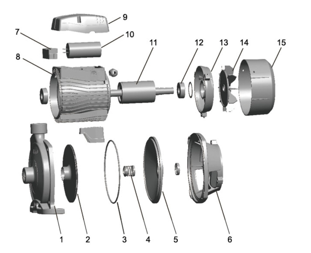 ● Рабочее колесо (2) (импеллер) выполнено из нержавеющей стали AISI 304 или латуни (в зависимости от модели).