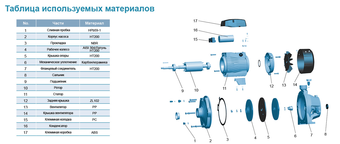 • Чугунный корпус насоса и специальная обработка антикоррозийным покрытием всех частей, контактирующих с водой